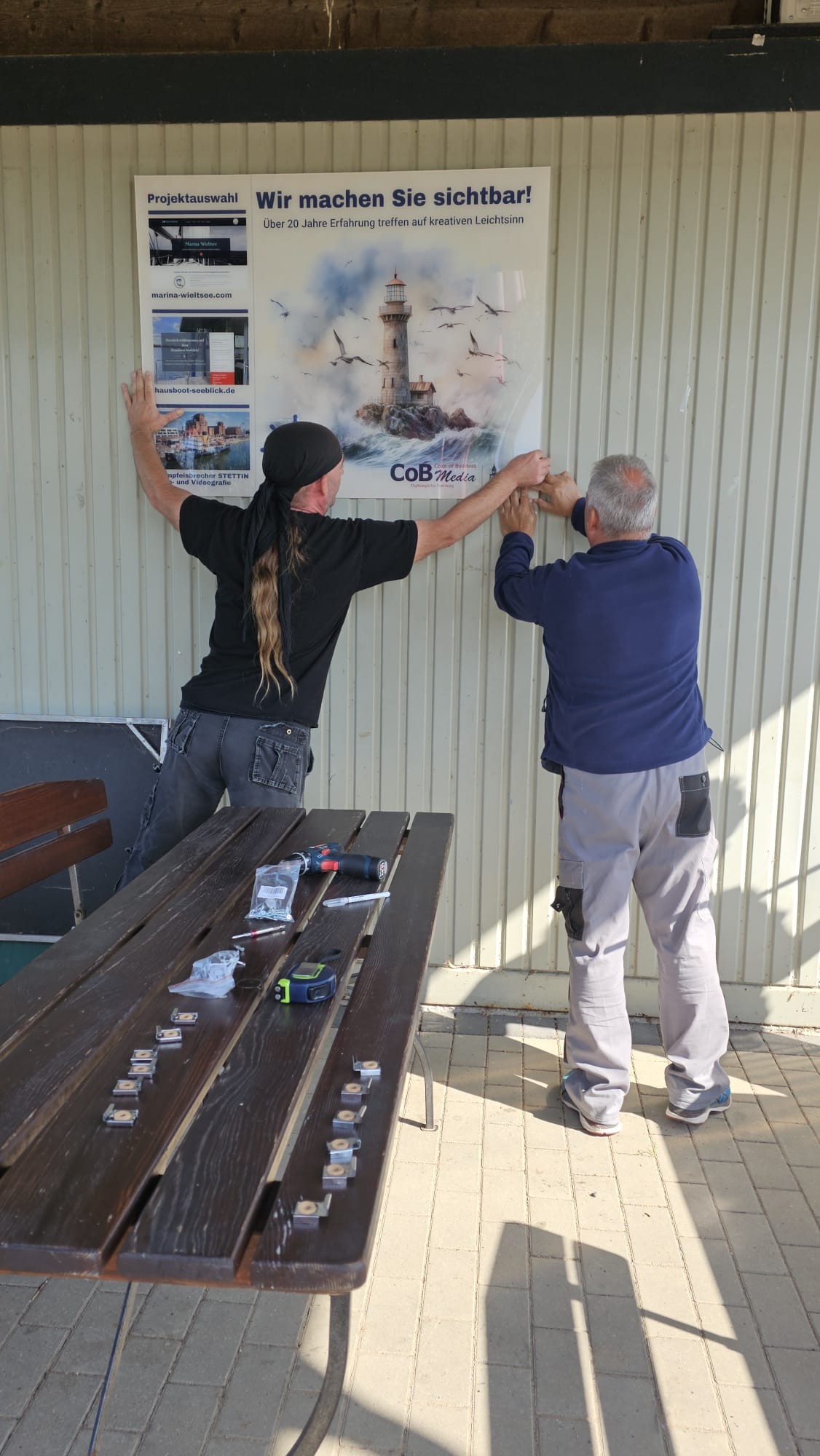 Die Sonne scheint über der Marina Wieltsee, als das neue maritime Werbeschild von CoB Media Heimathafen Aktuell am Büro des Hafenmeisters Axel angebracht wird. Mit Freude und Stolz präsentieren wir dieses neue Projekt, das nicht nur die Verbundenheit zur maritimen Welt zeigt, sondern auch unsere Expertise im Bereich der digitalen und analogen Medien unterstreicht.