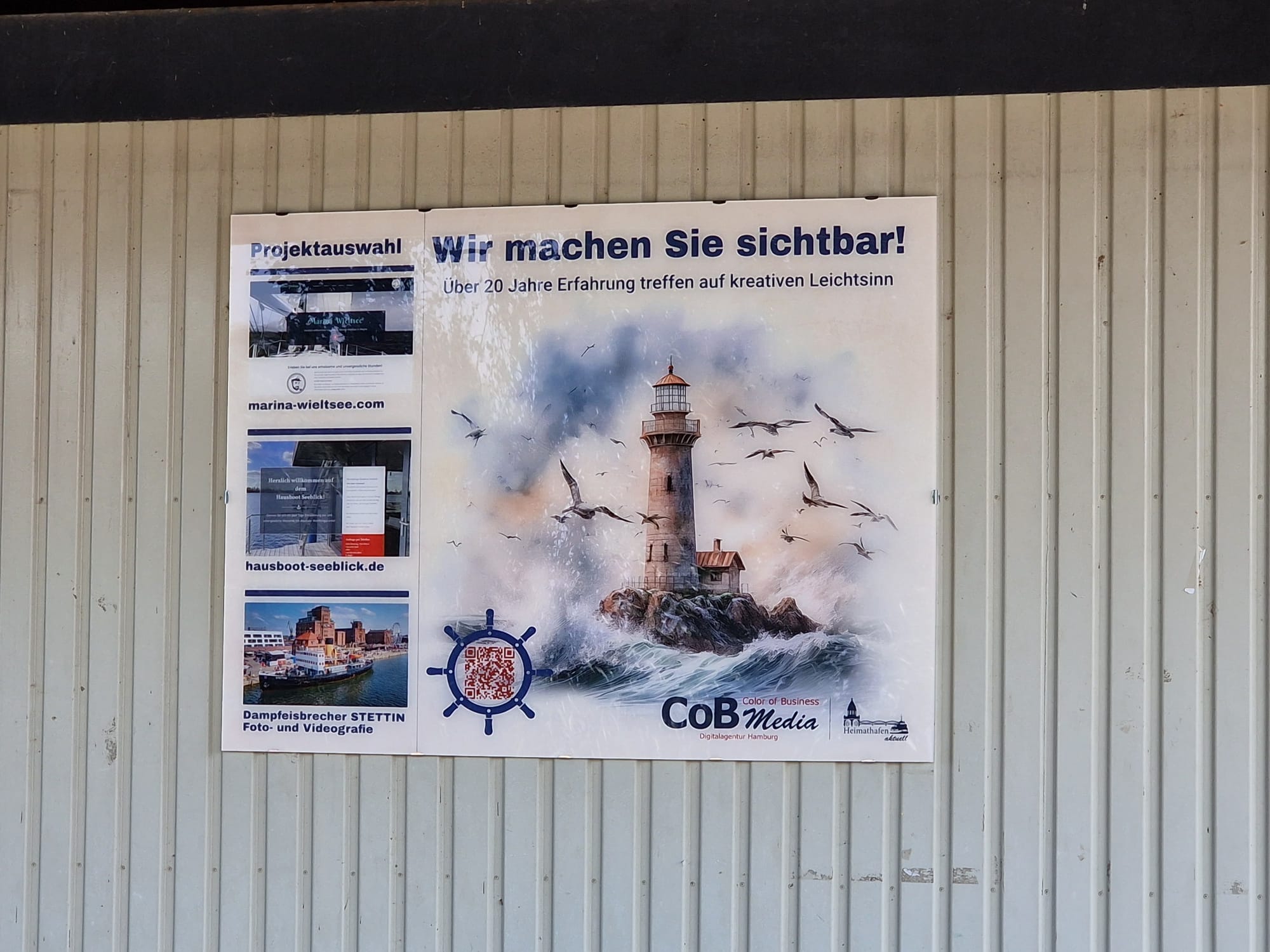 Für uns bei CoB Media | Heimathafen Aktuell ist dieses Schild nicht nur ein weiteres Projekt, sondern ein Versprechen. Ein Versprechen unsere Kunden im maritimen Bereich dabei zu unterstützen ihre Sichtbarkeit zu erhöhen und ihre Geschichten zu erzählen – sei es durch professionell gestaltete Webseiten, ansprechende Flyer oder kreative Printprodukte.